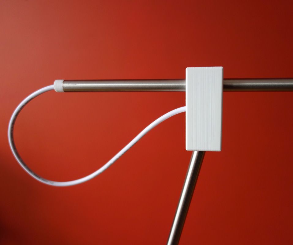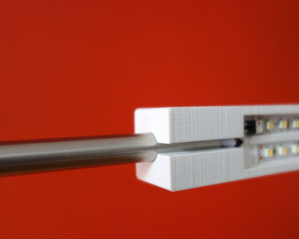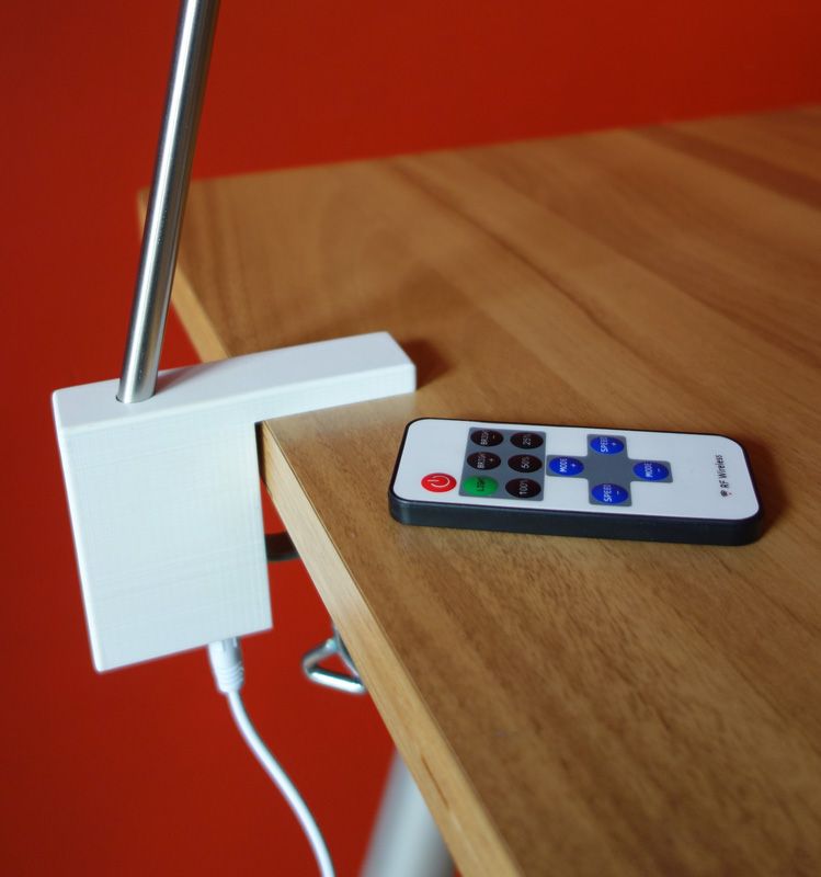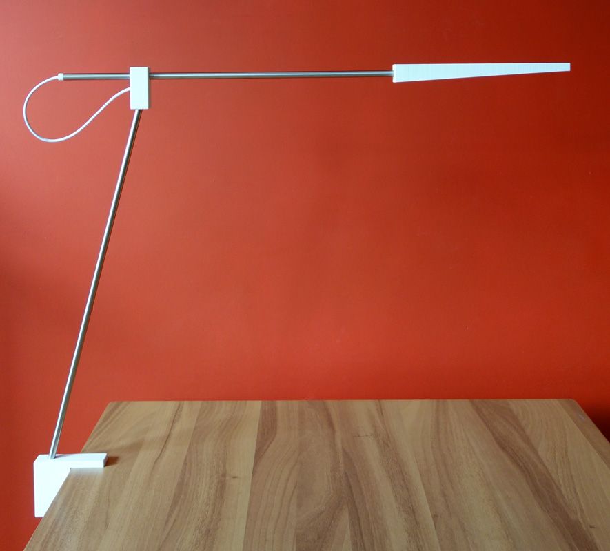 Buizen van roestvast staal 10 mm. De lampvoet wordt met een simpele ijzeren tafelklem (bijgeleverd) op de tafelrand geklemd.