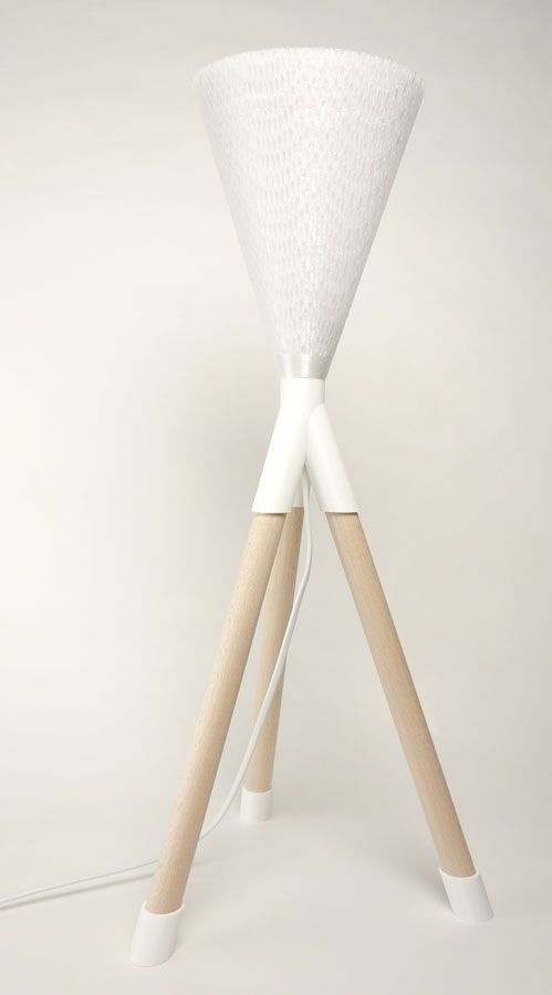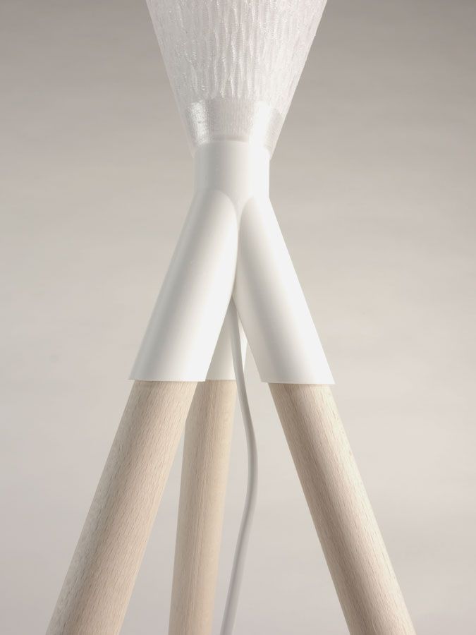 De verbindingselementen zijn geprint met PLA (biologisch afbreekbaar polymelkzuur). De kap is een halftransparant weefsel, geprint met PETG (zoals pet-flessen). Poten zijn van beuken rondhout 22 mm.