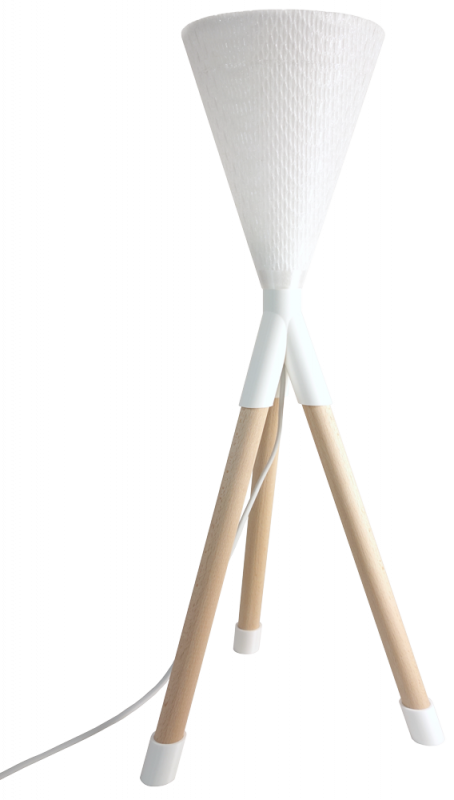 Tafellamp, bestaande uit 3D-geprinte onderdelen en beukenhout.
