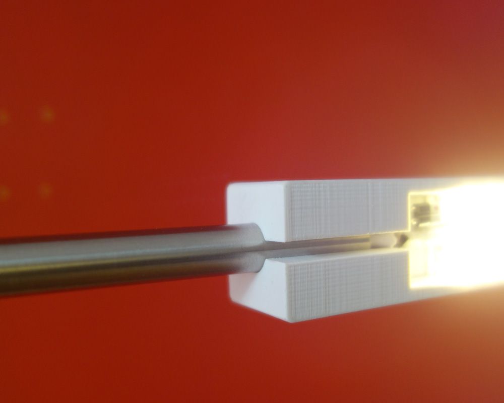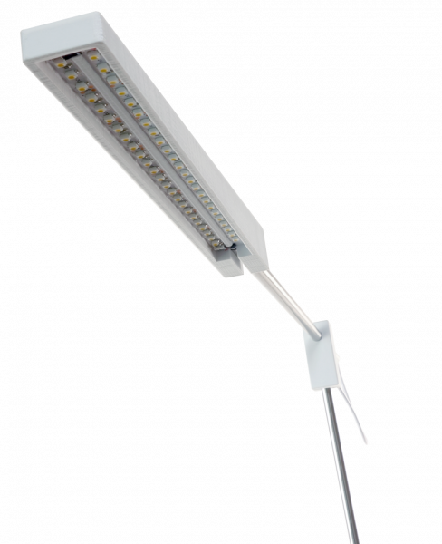 Buizen van roestvast staal 10 mm. De lampvoet wordt met een simpele ijzeren tafelklem (bijgeleverd) op de tafelrand geklemd.