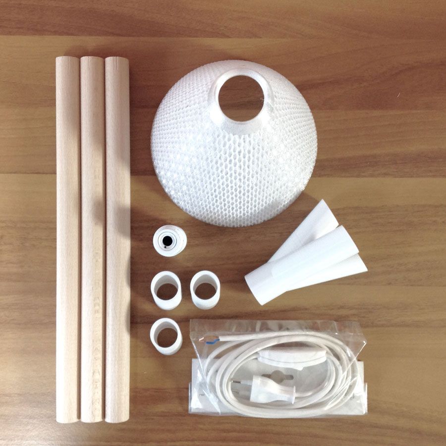 De verbindingselementen zijn geprint met PLA (biologisch afbreekbaar polymelkzuur). De kap is een halftransparant weefsel, geprint met PETG (zoals pet-flessen). Poten zijn van beuken rondhout 22 mm.